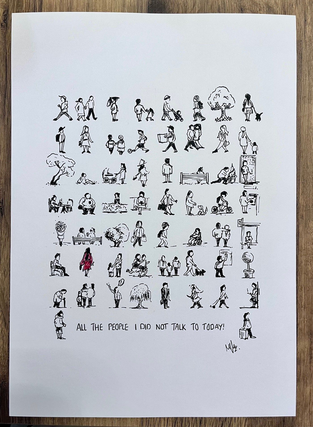 Hand drawn with in Ink with a single pop of colour. Supplied unframed.